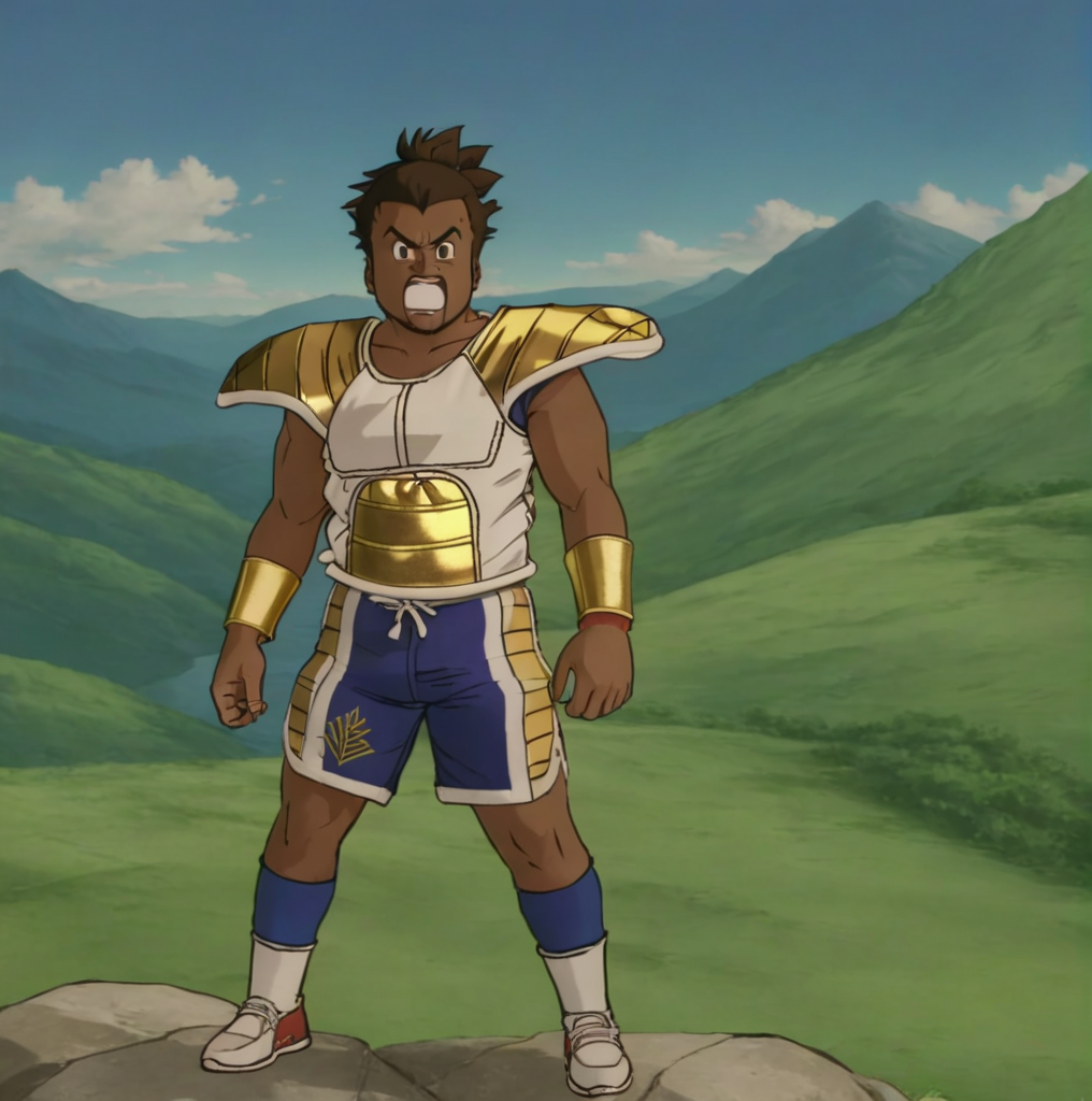 <lora:vagriiahxl:0.8> anime version of vgriiah, saiyan battle armor, saiyan vest, , on a mountain <lora:sdxl_lora_80scartoon:1>
