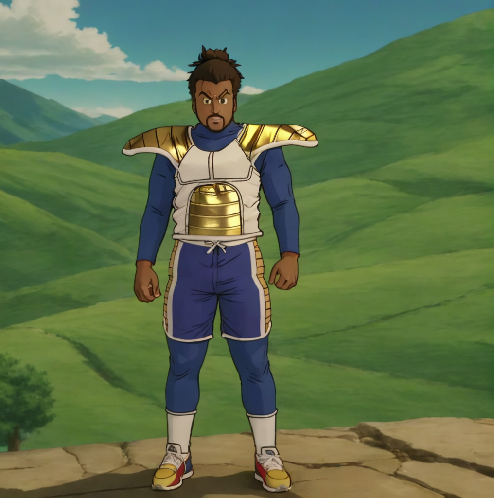 <lora:vagriiahxl:0.8> anime version of vgriiah, saiyan battle armor, saiyan vest, , on a mountain <lora:sdxl_lora_80scartoon:1>