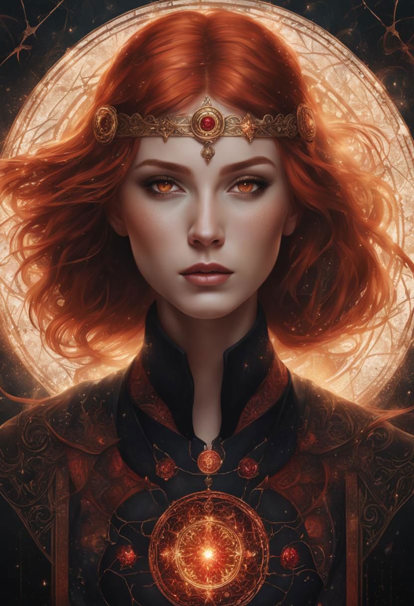 Semi realistic illustration of a middle-aged ginger girl, freckles, red digital eyes, dark atmosphere, dark fantasy, mage, sorcerer, in a circle frame, surrounded by abstract shapes and symbols