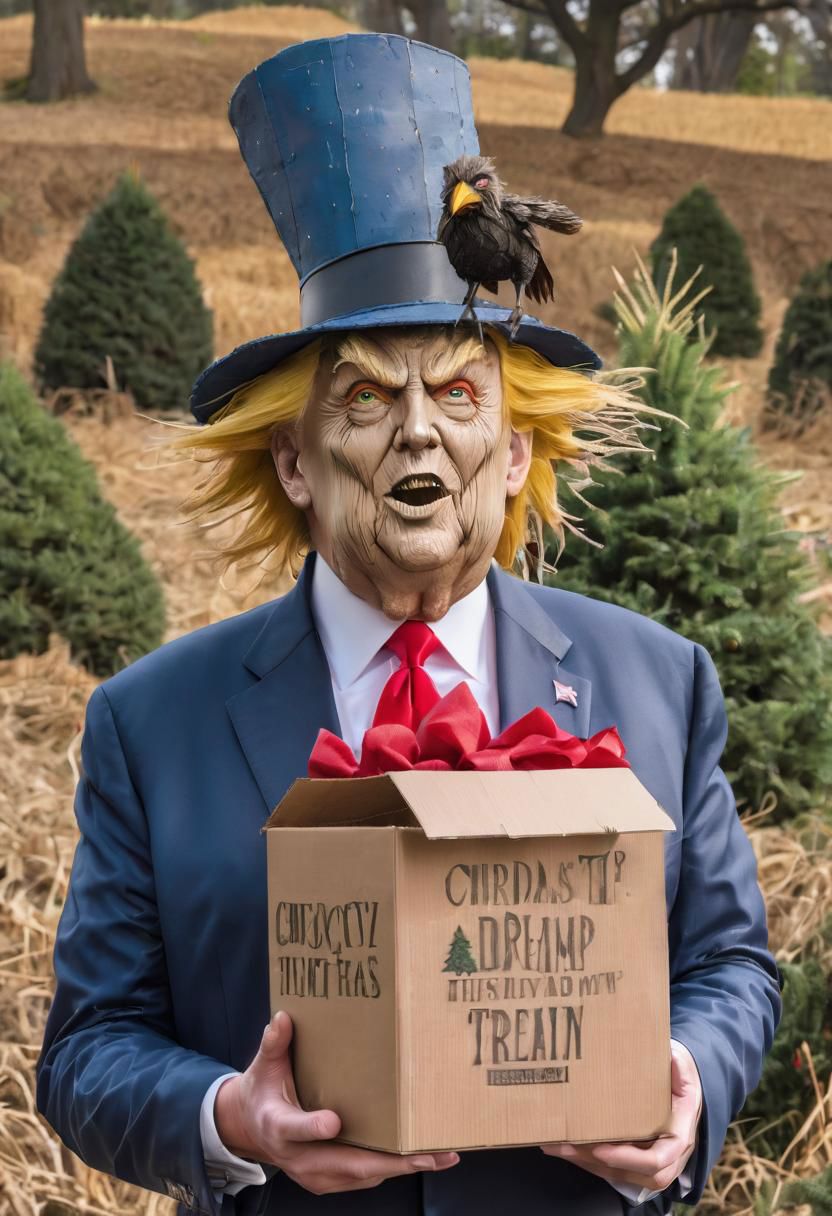 Donald Trump as Scarecrow from The Wizard of Oz, holding a box containing a brain, Christmas tree