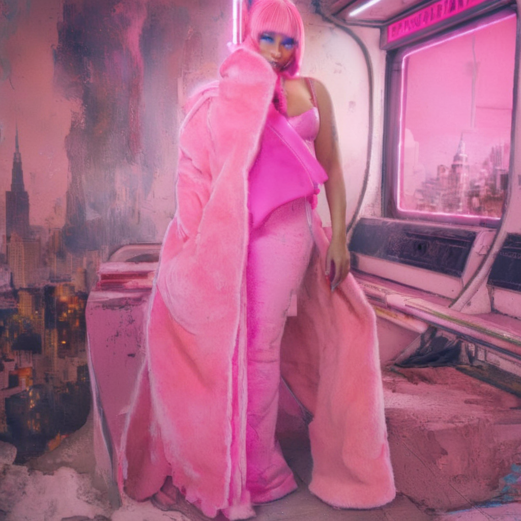 by Phil Foglio o <lora:nkmnjdreamxl:1.3> nkmnj, solo, nkmnj woman, holding a subway car rail wearing a fur coat, on a pink subway car, sun shining from behind pink Biomechanical cyberpunk, pink cybernetics, human-machine fusion, dystopian, organic meets artificial, dark, intricate,, (yellow but extremely beautiful:1.4), (masterpiece, best quality:1.4) , in the style of nicola samori, <lora:epi_noiseoffset2:0.5> <lora:add-detail-xl:1> <lora:xl_more_art-full_v1:0.5> <lora:NicolaSamori:0.7> low exposure with pink diffused light emitting from suit. wearing pink cybernetic suit, with glowing pink halo floating over head. wearing pink bob hairstyle,right arm inside of fur coat reaching to face