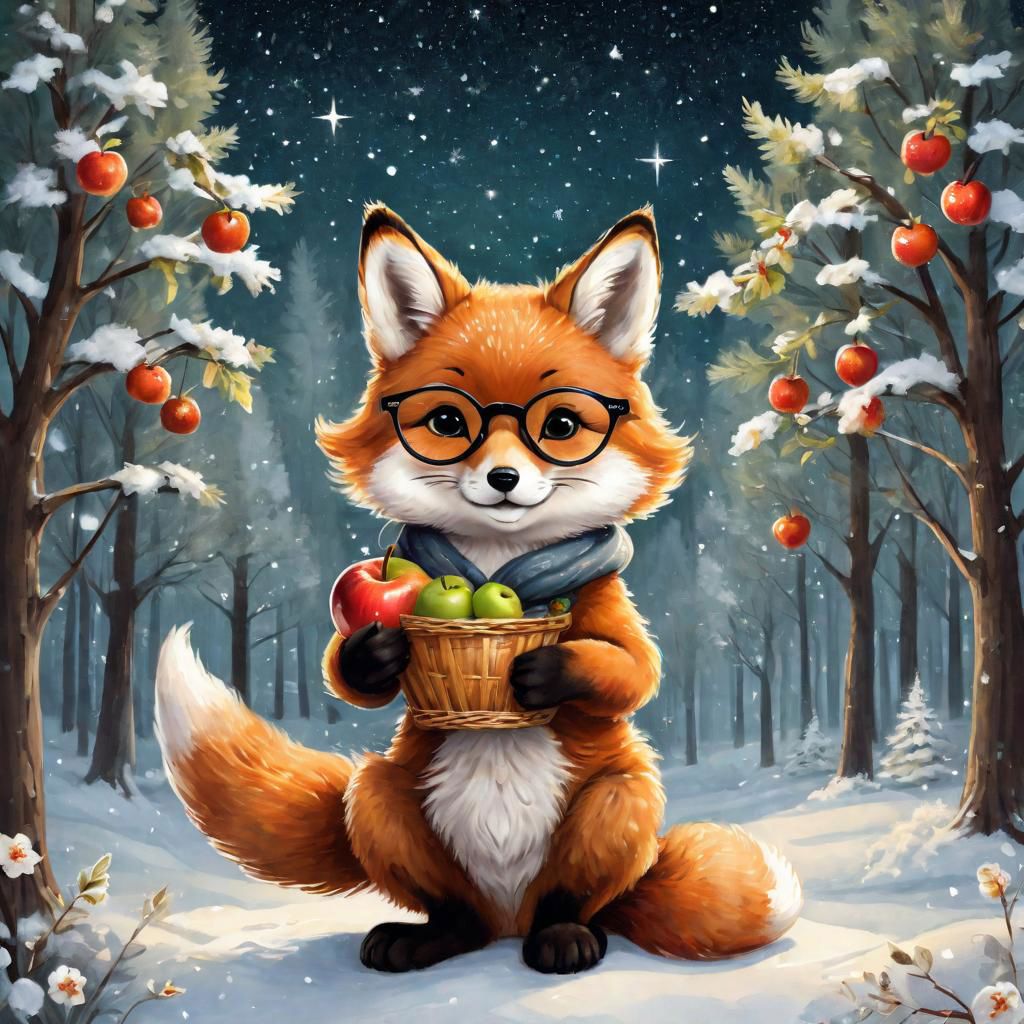 a cute curly fluppy brown smile fox with apple basket thumbs up glasses apple full body to head landscape winter forest night with flowers art by kajenna glasses apple full body to head landscape winter forest night with flowers art by kajenna