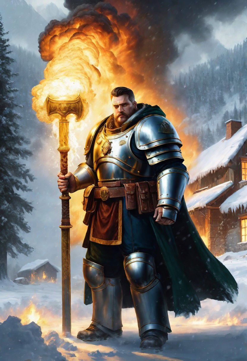 warhammer 40k, adeptus astartes, book cover, main character from dark angels spacemarine chapter, cloak, big sword, standing front, hood, high quality armor with skulls, quality background, high quality straight sword, male, snow area, knights, sword hits the ground, golden belt, standing next to bonfire, handsome face with beard, dark style,