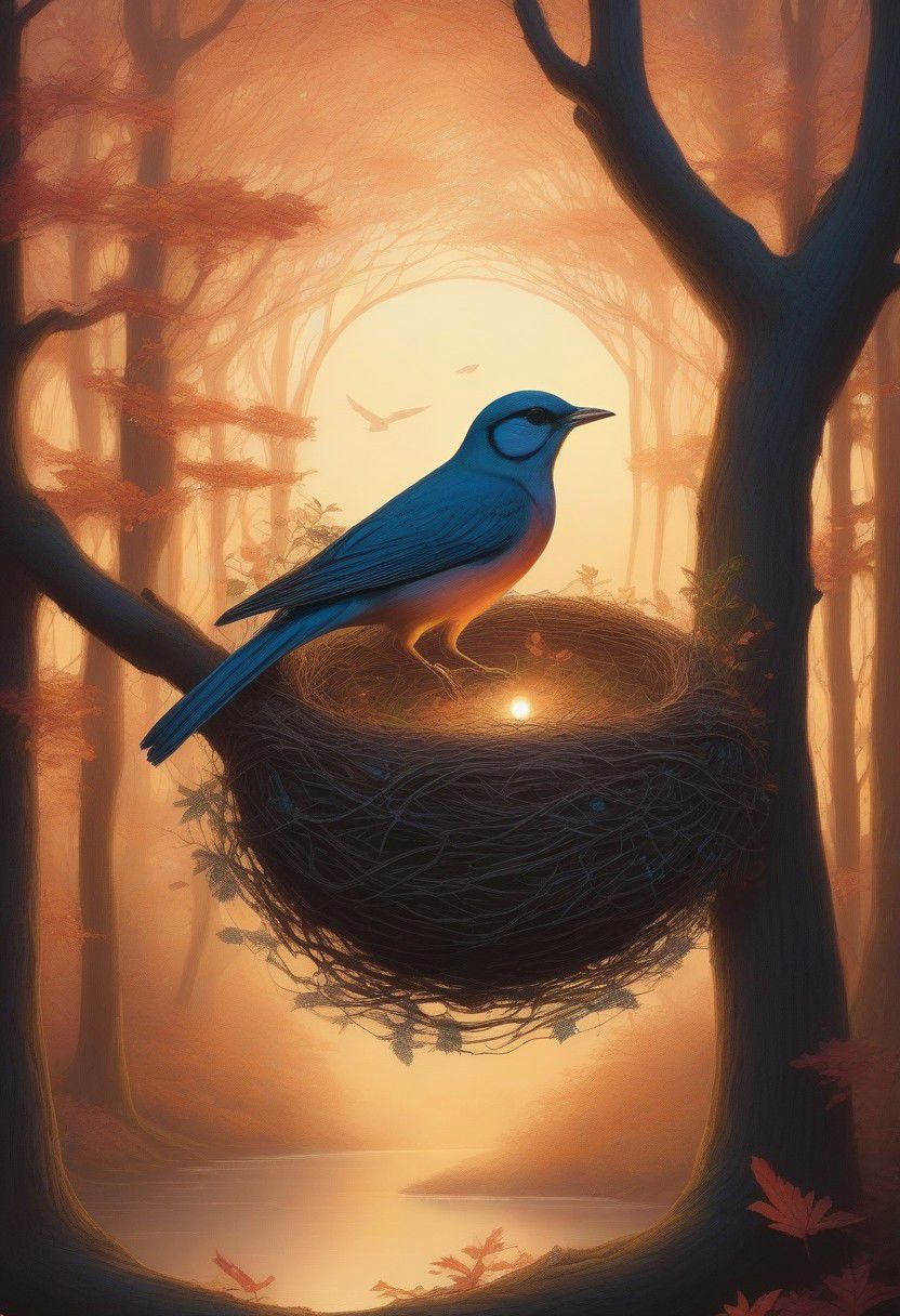 Insanely detailed illustration, beautiful composition!! A bird nestled in her nest, set against the backdrop of a forest at twilight. The nest, glowing with a soft, luminescent light, cradles the bird as she watches over her eggs. The forest around her is bathed in the gentle hues of dusk, with shadows and light playing across the leaves and branches. The scene combines the real with the surreal, creating an atmosphere of enchanting tranquility and natural magic. The bird and her nest are depicted with hyperrealistic detail, each feather and twig rendered with precision, glowing subtly as if illuminated by an inner light. The overall effect is ethereal, blending the bird and her nest seamlessly with the mystical forest environment, as if they are an integral part of this magical world. The colors are deep and vivid, adding to the intense and infinite feel of the scene.