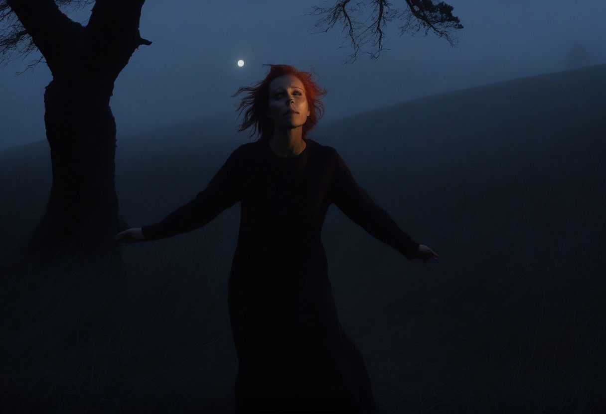 Wide shot of Rinze Morino under decaying tree on hill. Very Dark Night. Very Dim dark-orange Light from side. Long Grass. Dim Silver Moonlight. Dark valley in background. Thick Fog in valley. Standing Close to Gate. Dancing energetically. Celebrating. Arm raised. Laughing. Very Short messy Dark-Red hair with side-parting and undercut. Very Tanned Skin. Shoulders. Implied-nude. Small breasts. Oil Painting. (appropriate shadowing), (appropriate direction of light), Very Dark background.