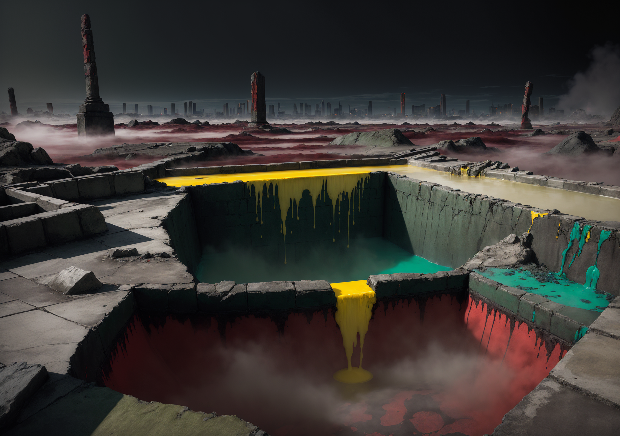 masterpiece, oil on canvas, Wayne Douglas Barlow style, (dark theme), evil:ancient:machine architecture theme, hell labyrinth theme, "The slums of hell", ((dark ((blood red fog) blocking out the sky))), [obsidian:golden] building ascending into the red dark sky, buildings constructed out of ancient steles, (((dark deep pools:pits of (boiling green and yellow acid) at the bottom))), alongside a steep endless descending obsidian wall, barren wasteland terrain, dead hellscape, intricate details, best quality