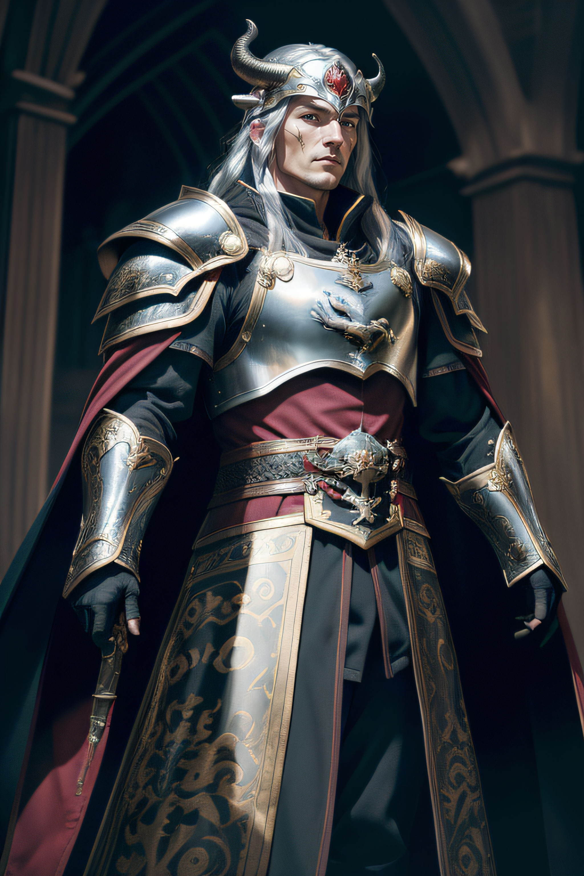 1boy (english man), 35 years old man (silver long hair:1.5), (black and red robes), full armor, black and golden plate, black and golden armor, (dragon's head shoulder pad:1), (dragon's horn helmet:1.3), fearless, (dragon emblem:1.3), (royal attire:1.2), (aura of power), (loyal subjects:1.2), (dragon's gaze), (intense charisma:1.3), (mighty conquests:1.4), (fiery legacy), (dragonborn symbol:1.2), (golden commander's cape:1.1), (courageous heart), (imposing figure), (fearless leader:1.2), (black cloak), (valiant spirit), (dragonfire emblem:1.3), (green eye:1.1), elemental particles, (crouched:1) (from below:1.5), (Photorealistic), (Hyperrealistic), (Hyperdetailed), (analog style), (detailed skin), (matte skin), (soft lighting), (subsurface scattering), (realistic), (heavy shadow), (masterpiece), (best quality), (ultra realistic), (8k), (Intricate), (High Detail), (film photography), (shrp focus), (detailed skin texture), (elegant)
