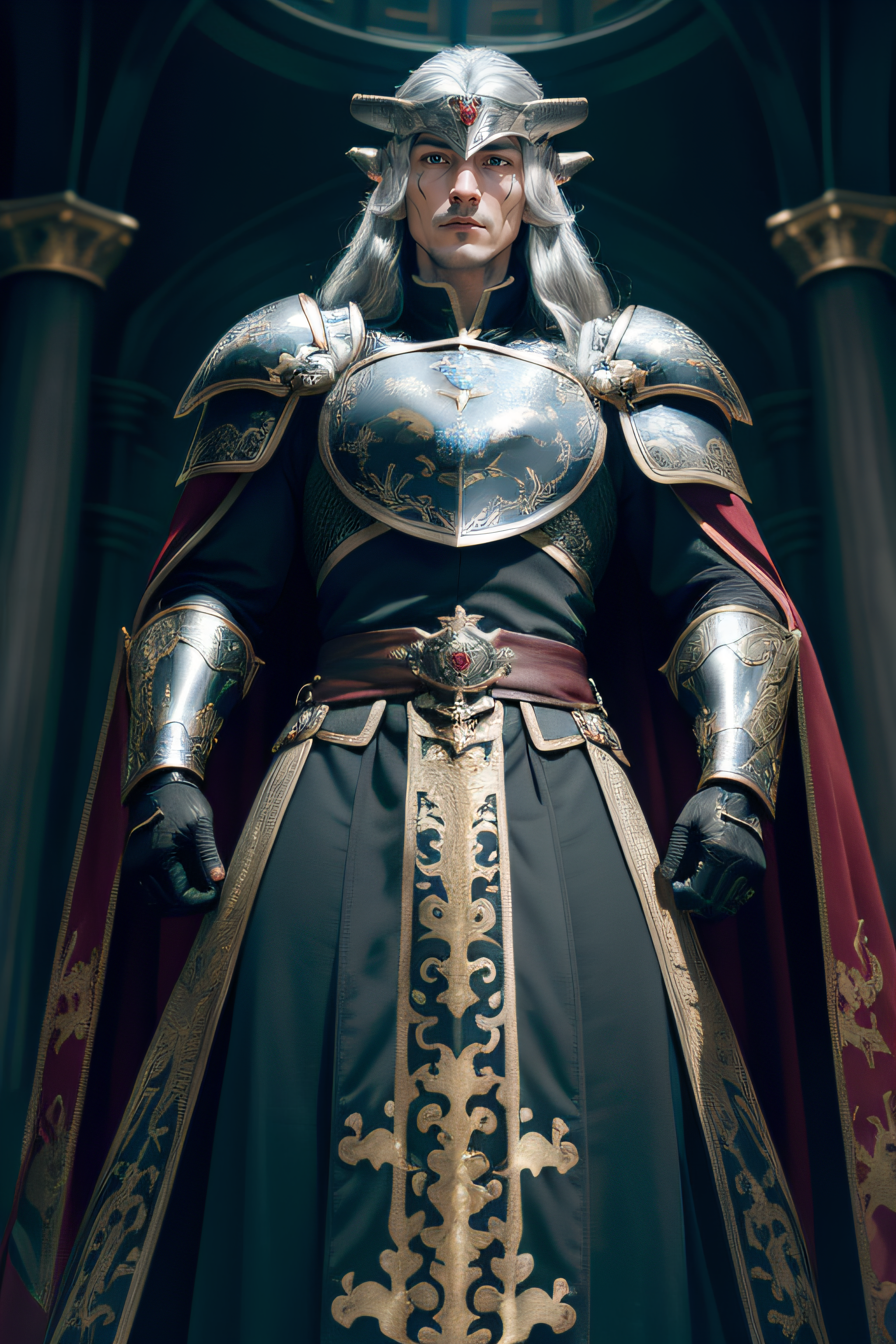 1boy (english man), 35 years old man (silver long hair:1.5), (black and red robes), full armor, black and golden plate, black and golden armor, (dragon's head shoulder pad:1), (dragon's horn helmet:1.3), fearless, (dragon emblem:1.3), (royal attire:1.2), (aura of power), (loyal subjects:1.2), (dragon's gaze), (intense charisma:1.3), (mighty conquests:1.4), (fiery legacy), (dragonborn symbol:1.2), (golden commander's cape:1.1), (courageous heart), (imposing figure), (fearless leader:1.2), (black cloak), (valiant spirit), (dragonfire emblem:1.3), (green eye:1.1), elemental particles, (crouched:1) (from below:1.5), (Photorealistic), (Hyperrealistic), (Hyperdetailed), (analog style), (detailed skin), (matte skin), (soft lighting), (subsurface scattering), (realistic), (heavy shadow), (masterpiece), (best quality), (ultra realistic), (8k), (Intricate), (High Detail), (film photography), (shrp focus), (detailed skin texture), (elegant)
