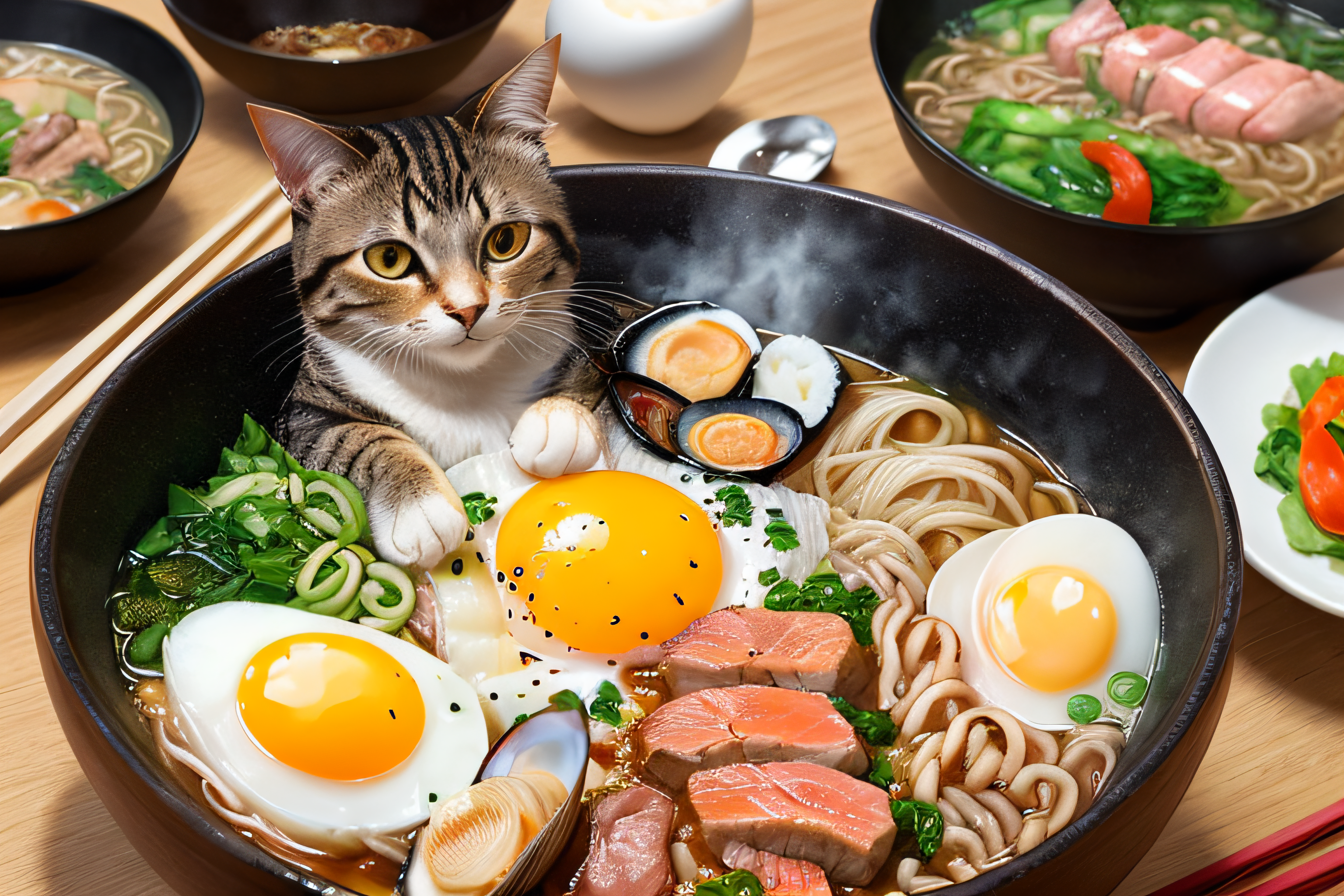 ultra detailed 8k cg, a cat is eating japanese ramen, chopsticks, egg, steam, a lots of meat, some clams, some shrimp,