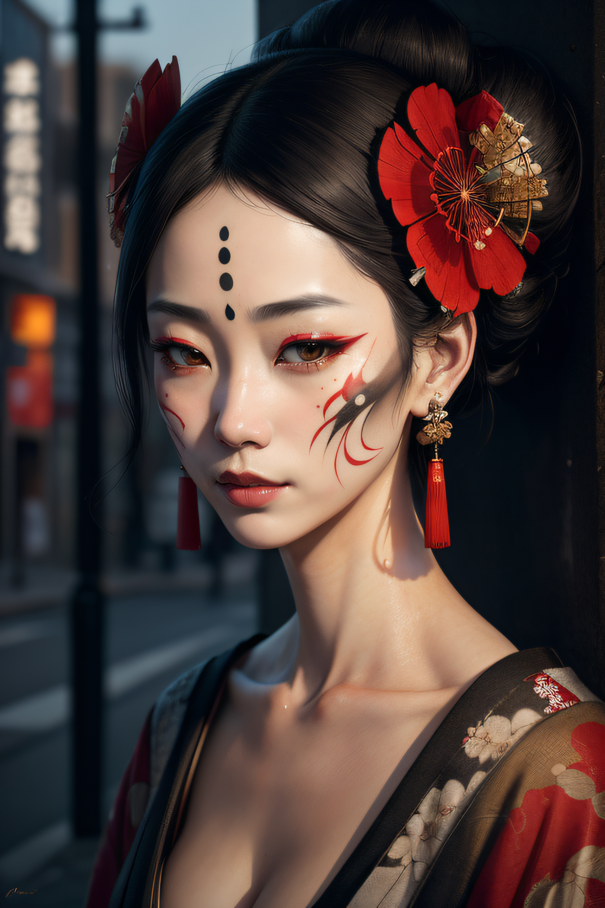 Street Art: On a city wall, a street artist portrays "The Sad Geisha" using (graffiti-style art:1.3). Her teary eyes reflect the harsh realities of life. Around her are (urban elements:1.2) like (gritty textures:1.1) and (faded posters) symbolizing the passage of time. The street art's (raw emotion:1.2) resonates with passersby, creating a connection to the geisha's sadness., (Photorealistic), (Hyperrealistic), (Hyperdetailed), (analog style), (detailed skin), (matte skin), (soft lighting), (subsurface scattering), (realistic), (heavy shadow), (masterpiece), (best quality), (ultra realistic), (8k), (Intricate), (High Detail), (film photography), (shrp focus), (detailed skin texture), (elegant)