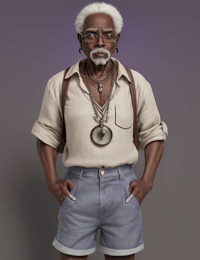 male Geriatric Hourglass, African, Steel gray eyes, Pointed Chin with Cleft, Sunken Cheeks, Rounded Forehead, Defined Jawline, Cheekbones, Lavender Box braids hair, Admiration, wearing Amethyst Cotton Denim bermuda shorts, Linen shirt, , , , Standing with crossed arms and raised eyebrow, indicating skepticism