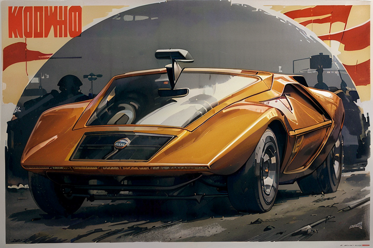 (best quality:1.2), masterpiece, (silver Lancia Stratos Zero car, <lora:l4nc145tr4t05z3r0:1>), sexy solo blond girl on background, dressed in black stockings, simple background, (red soviet flags:0.8), wide angle, soviet poster, <lora:soviet-poster:0.7>