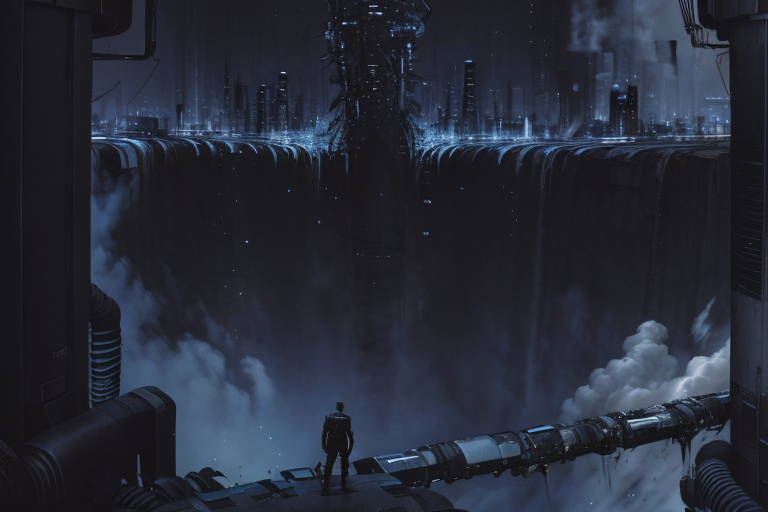 blame, <lora:blame:1> a man wandering in a giant lost cyber city alone, dark, cool, far view, FOV,wide angle,killy, 1boy,