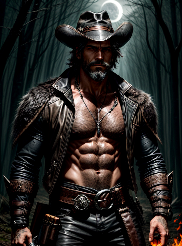 Create an image of a rugged and roguish man, embodying the spirit of a beast master, witch hunter, monster gatherer, and pirate. He's tall, muscular, clad in weathered, dark leather adorned with runic symbols. His face is hidden by a wide-brimmed hat, sporting a scruffy beard and intense, mischievous eyes. Around his waist, an assortment of tools: finely crafted blades, vials of mysterious potions, and monster-hunting implements. On his shoulders, loyal fearsome creatures - his mysterious animal companions - showcasing their abilities. The scene unfolds at a moonlit gloomy forest's outskirts. Torches and campfire illuminate, playful shadows dance around, emphasizing his rogue-like nature. In one hand, a half-filled tankard of ale, savoring a drink with nonchalance amidst peril. The other hand grips a well-worn sword, ever-ready for challengesPhotographic realism. <lora:more_details:1.5>