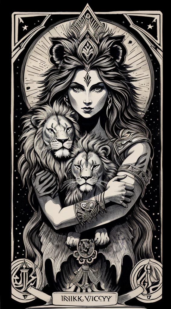 (ink painting, ink art, ink drawing, graphic ink), rough, hand-painted, (abstract, stylised), textured black background, solo, (tarot), semi symmetrical, portrait, <lora:add_detail:0.7> (tarot power:1.2), the Goddess of Victory is bending over and stroking a fierce lion, soothing the lion in her arms with tenderness and love,