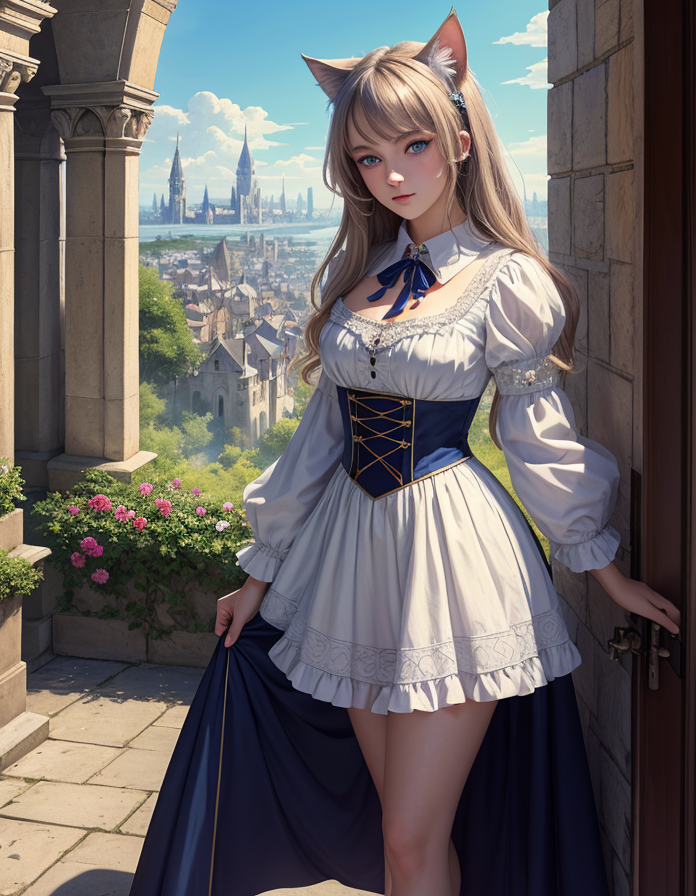 (masterpiece, top quality, best quality, official art, beautiful and aesthetic:1.2), catgirl, blue eyes, detailed face, small chest, full body, skirt and blouse, highest detailed, fantasy medival city background, realistic, best quality
