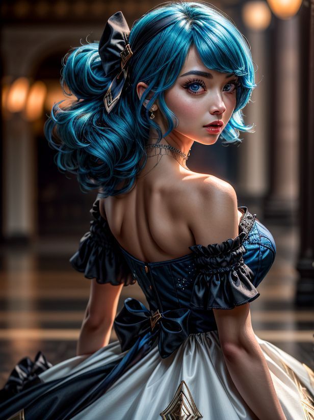 4k, 8k, best quality, ultra high res, (photorealistic:1.1),(masterpiece:1.2), best quality, masterpiece, highres, original, extremely detailed wallpaper, (ultra-detailed), (best illustration), (eyes detailed), (best shadow), (realism), realistic, 1girl, medium breasts, blue hair, long hair, black formal dress, long dress, ballroom ((two hands behind the back:1.1)), gwen \(league of legends\), close up, <lora:more_details:0.65>, <lora:gwen-000037:0.7>