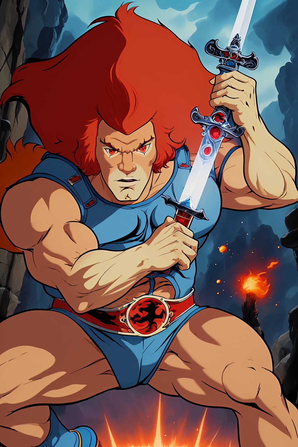 cartoon,best quality, masterpiece, detailed, lion-oQuiron character, 1boy, red hair, rampage, sword, blue outfit, <lora:quiron_lion-o_v2_Lora:0.77>