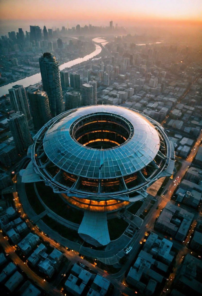 Alien cityscape at dawn (Deep Focus) contrast (f_stop 2.8), (focal_length 35.0) f/2.8, 35mm focal length Photograph of (view from above:1.3), analog photo, silhouette, spotlight, capturing the intersection of organic architecture and high technology. Structures defy gravity, with the planet's ringed companion on the horizon. Prismatic light reflects off surfaces, creating a palette of dawn colors. RAW candid cinema, 16mm, color graded portra 400 film, remarkable color, ultra-realistic, captured on a Fujifilm X-Pro3 / (f_stop 16.0), (focal_length 24.0)