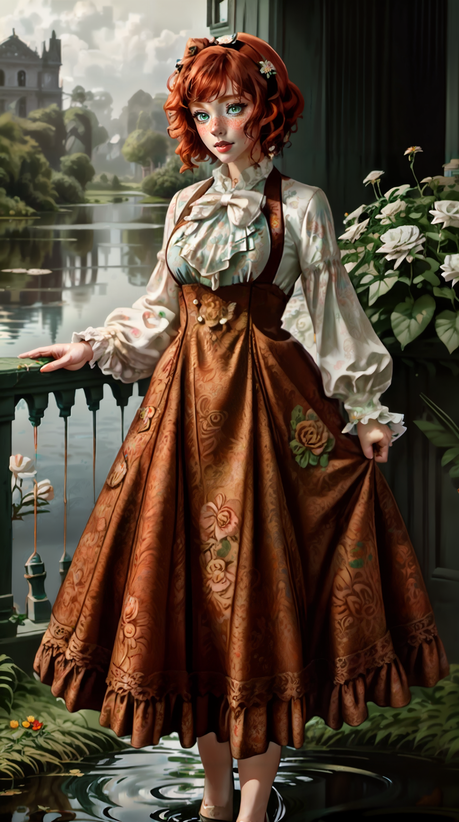 (Loved Painting:1.3)of(Visual novel:1.3), (Romantic:1.3)Fullbody gardenia_portraits <lora:Gardenia_Portraits-10:0.7>of a beautiful irish woman, erica <lora:EricaMurphy_1.5>, freckled skin, large doe green eyes, short curly red hair, wearing bs dress <lora:BS:1>, wading through a misty lake, (Rococo:1.3), (Offset print:1.3)