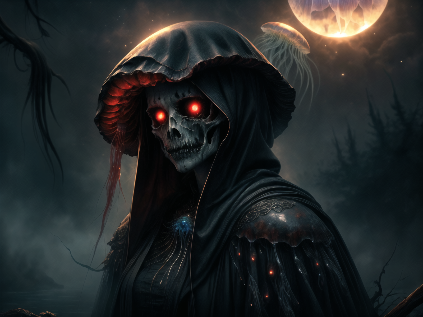 cosmic horror, organic Nightmare alien (female humanoid+ jellyfish creature made out of dark blood:1.3)++, scary, horror, fantasy dreamlikeart, digital painting, highest resolution, fine painting, 8k, artstation HQ, extremely detailed 8k wallpaper, trending on ArtStation, trending, Intricate, High Detail, Sharp focus, dramatic (full moon), realistic, pale skin, ominous aura Halo, foggy, mist, (very detailed undead background:1.0), (highly detailed background:1.0), masterpiece, best quality, space, cosmos, magic, intricate, illustration, [symmetrical face], tone mapped, highly detailed, artstation, concept art, smooth, sharp focus, dramatic lighting, art by dandon fuga, chromatic aberration, depth of field, soft lighting, (blood dripping down fingers) , tentacles from face, ((a dark shadow in a cloak with an elk skull head)), dark, ominous background, on a boat, render, grim reaper, full moon, bloodborne, <lora:jellyfish-noise:.5>, <lora:CosmicEldritchTech:.5> <lora:add_detail:.5> <lora:more_details:.5>