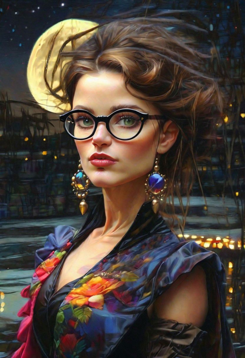A close-up portrait of an enchanting lady adorned in fantastical garments, her glasses reflecting the vibrant moonlit landscape as she appears to defy gravity, all rendered in the signature style of renowned artist Casey Baugh.