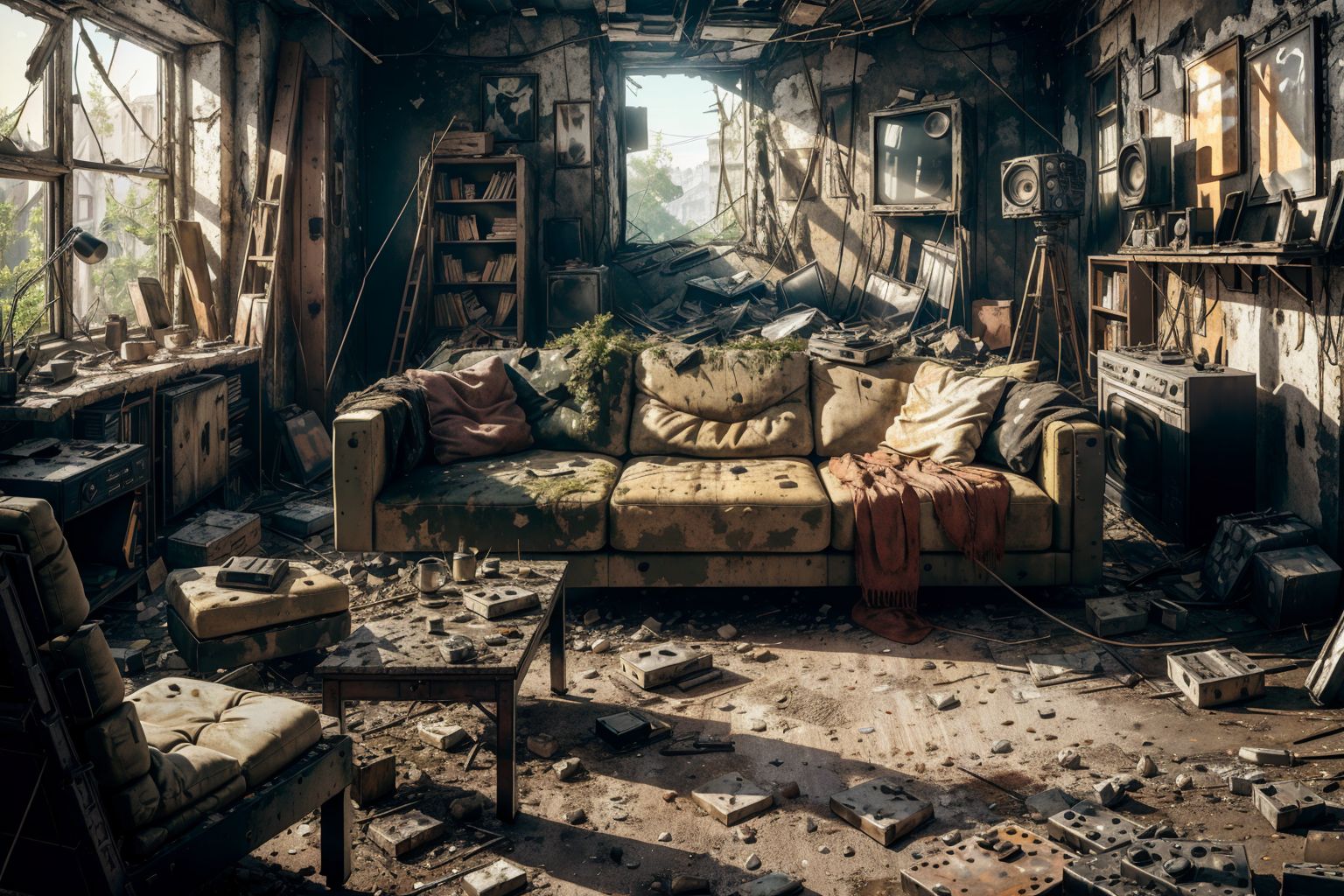 8k, realistic, vray, HDR, 6000K, on a post-apocalyptic living room, torn sofas, shattered tv, faded family photographs, worn carpet. <lora:PostApocalyptic_v4:0.6> SZ_4po enviroment