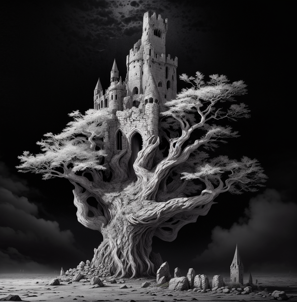 highly detailed illustration of a dark fantasy landscape at night time with fog, crumbling stone tower, twisted glowing white tree, shadows of crumbling stone keep with one small window, foggy background, dark gothic fantasy, haunted surrealism, medieval ruins, elden ring, foggy mysterious night, lord of the rings <lora:add_detail:0.7>