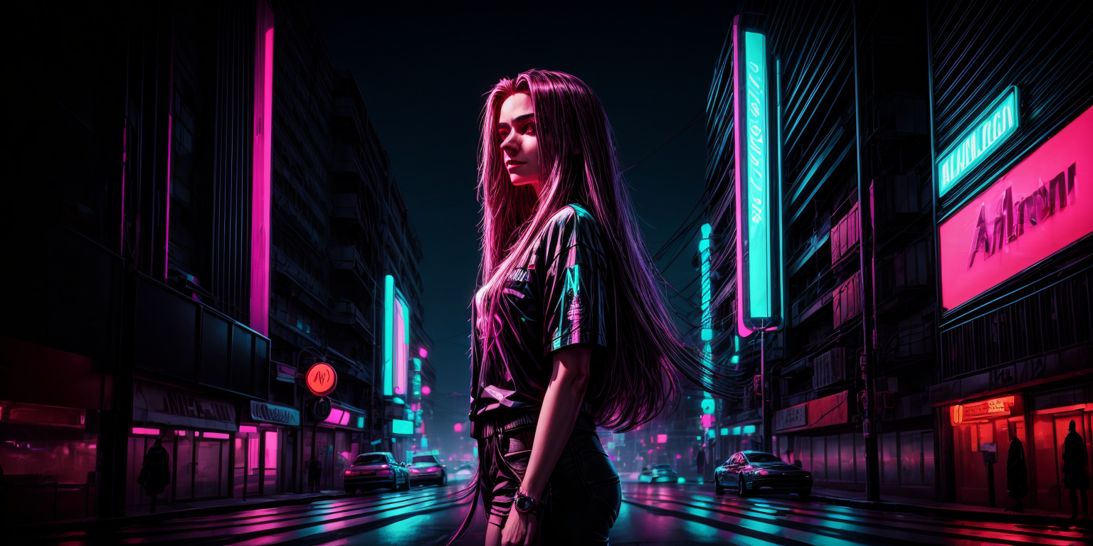 a woman with long hair standing in the middle of a street at night with neon lights on her shirt, Alena Aenami, synthwave style, cyberpunk art, computer art, <lora:add_detail:1>, <lora:more_details:1>,