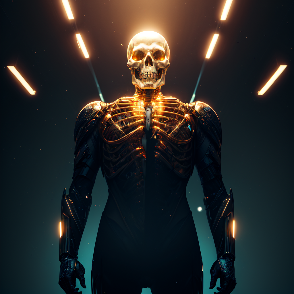 ,skeleton man wearing (business suit:1.3), golden skull, gold,space background,(business suit:1.3), gold,shiny,<lora:clothing_explosion_lora01:1> ,tron clothes, official art,finely detail, Depth of field,(((masterpiece))),((extremely detailed CG unity 8k wallpaper)),best quality, high resolution illustration,Amazing,highres,intricate detail,(best illumination, best shadow, an extremely delicate and beautiful),, Cinematic Lighting,,dark, (underlighting:1.2), <lora:SLS:1.0>,, <lora:add_detail:1>
