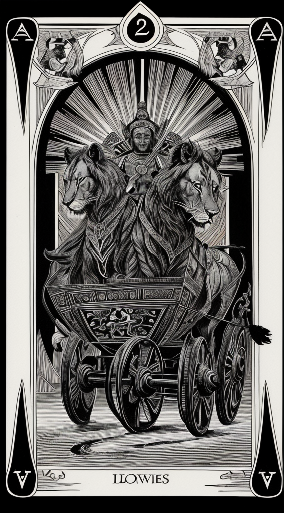 (ink painting, ink art, ink drawing, graphic ink), rough, hand-painted, (abstract, stylised), textured black background, solo, (tarot), semi symmetrical, portrait, <lora:add_detail:0.7> (tarot chariot:1.2),The Warrior on the chariot with a powerful posture, showing his great achievements in the world. The two lions, one black and one white, pulling the chariot, Warrior