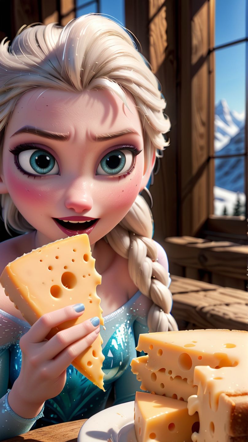 A photo of elsa really really enjoying cheese,<lora:princess_xl_v2:0.8>,
