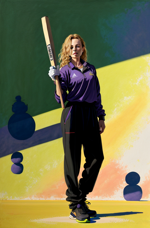 a stunning painting of olgaabram holding a cricket bat, facing a floating boulder, PURPLE shadows cast onto lime ground, in the style of <lora:roger_dean:0.7> <lora:_20230803165314:0.5>