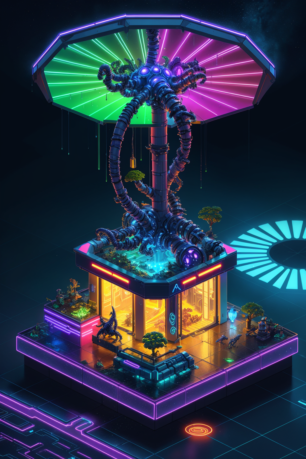 detailed,smooth shading,neon lighting,((isometric)) render of alien predator sci-fi organic technology world,intricate,elegant,illustration,, Geyser, Raining, vibrant colors