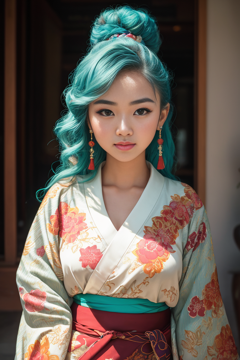 high quality color professional close up portrait of twenty-something canadian woman square face pointed nose aqua __uds_wildcards/personmaker/eyeshape__ eyes forehead folds straight faded_multicolor afro western kimono mini skirt clutches dusk photorealistic:1.4, best quality, realistic, masterpiece, high quality, UHD, shadow, taken by Canon EOS, SIGMA Art Lens 35mm F1.4, ISO 200 Shutter Speed 2000