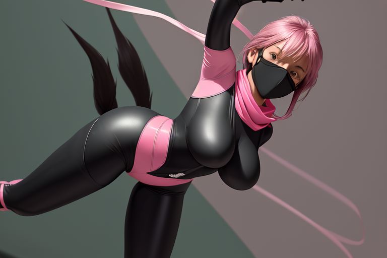 an ebony hooed woman a black spandex bodysuit, with pink pink trails going from the back of her chest to up to her collar from each side, pink trail following down on her bodysuit's arm-sleeves and gloves,hood and mask are green with a scarf covering around her neck, two long ribbon wrapped green scarfs around the back of her waist that follow behind her like great tails swooshing around by the wind, around her waist she has utility-belt on each side of her hips and more pink trails would be following down the side of her legs and inner-thighs completting the pattern of her bodysuit's color as the rest of bodysuit's color is black.