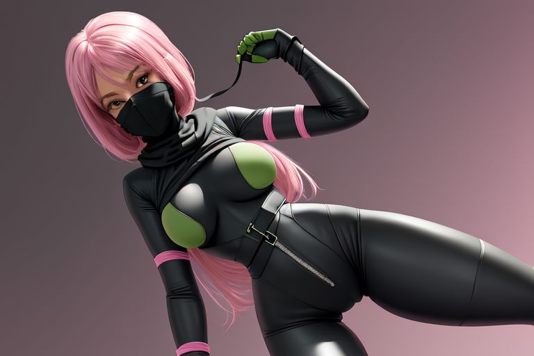 an ebony hooed woman a black spandex bodysuit, with pink pink trails going from the back of her chest to up to her collar from each side, pink trail following down on her bodysuit's arm-sleeves and gloves,hood and mask are green with a scarf covering around her neck, two long ribbon wrapped green scarfs around the back of her waist that follow behind her like great tails swooshing around by the wind, around her waist she has utility-belt on each side of her hips and more pink trails would be following down the side of her legs and inner-thighs completting the pattern of her bodysuit's color as the rest of bodysuit's color is black.