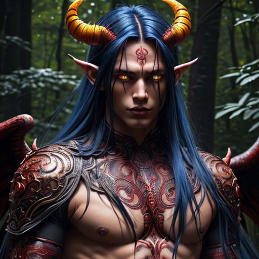 ASCIIhuman, 1demon, 1man, man, demon, wings, red skinned male, blue hair, long hair ,armor, yellow eyes, in the woods, demon tail, demon horns, highly detailed, ((masterpiece)), ((best quality:1.2)), high resolution, 8k, (ultra_realistic:1.3), (photorealistic:1.4), sharp focus, Show More