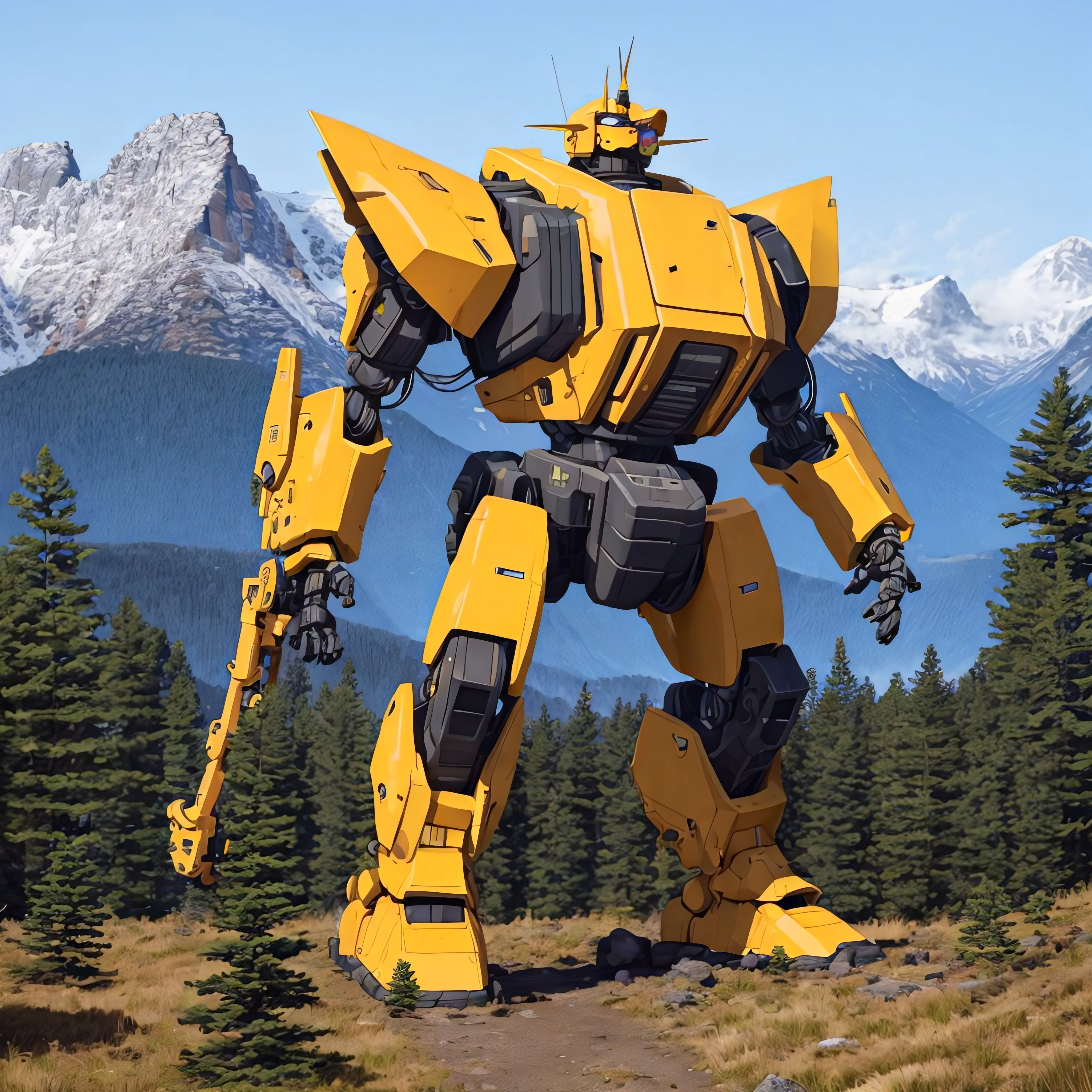 A giant yellow robot, snowy mountains, pine trees, stalenh4g <lora:Stalenh4g:0.5> <lora:Goodsell_v1:0.5>