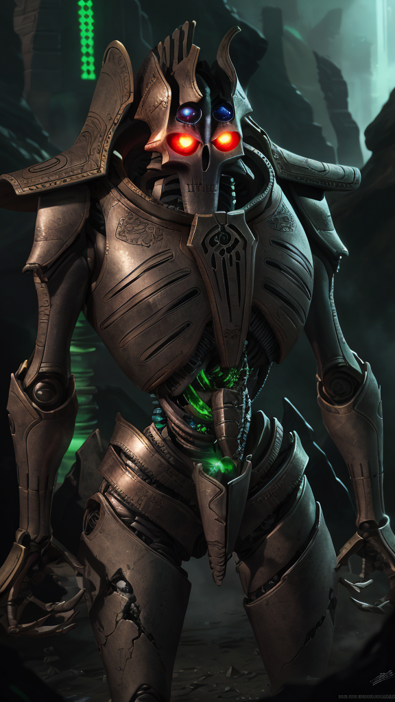 breathtaking Necrons, extremely beautiful multicolored glowing piercing eyes, cinematic scene, scenery, detailed background, masterpiece, best quality, high quality, absurdres <lora:necrons_v2:1> . award-winning, professional, highly detailed
