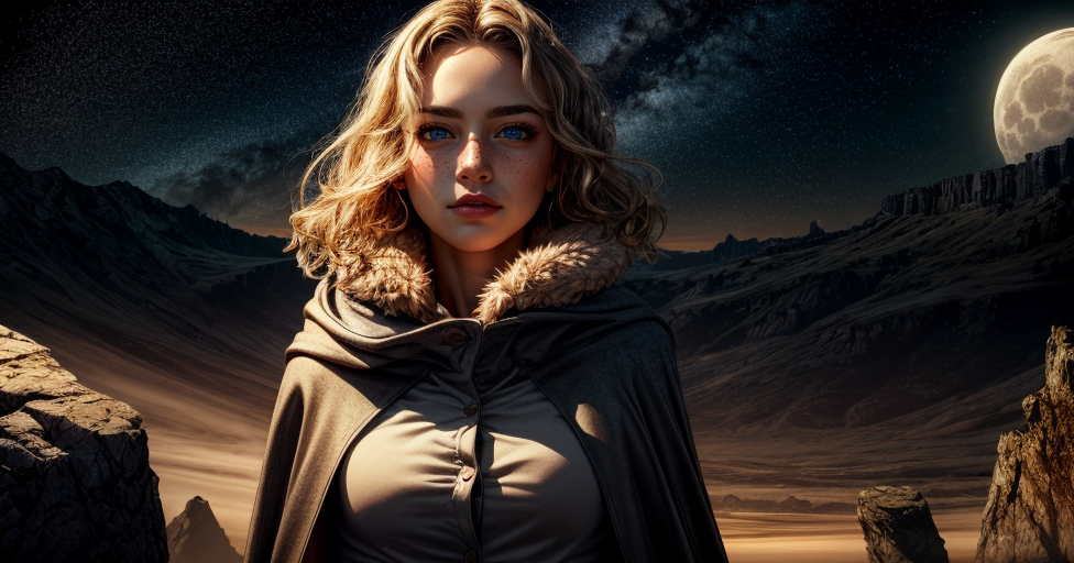 A mysterious figure, wrapped in a cloak adorned with intricate celestial patterns, stands gracefully on the edge of an ancient stone platform, under the soft glow of a distant moon, with the vastness of an alien landscape stretching behind them. Captured from a low angle, with a wide-aperture lens, the enigmatic persona exudes an aura of otherworldly power, reminiscent of the style of Annie Leibovitz, <lora:add_detail:1> <lora:add_saturation:1> <lora:add_sharpness:1>