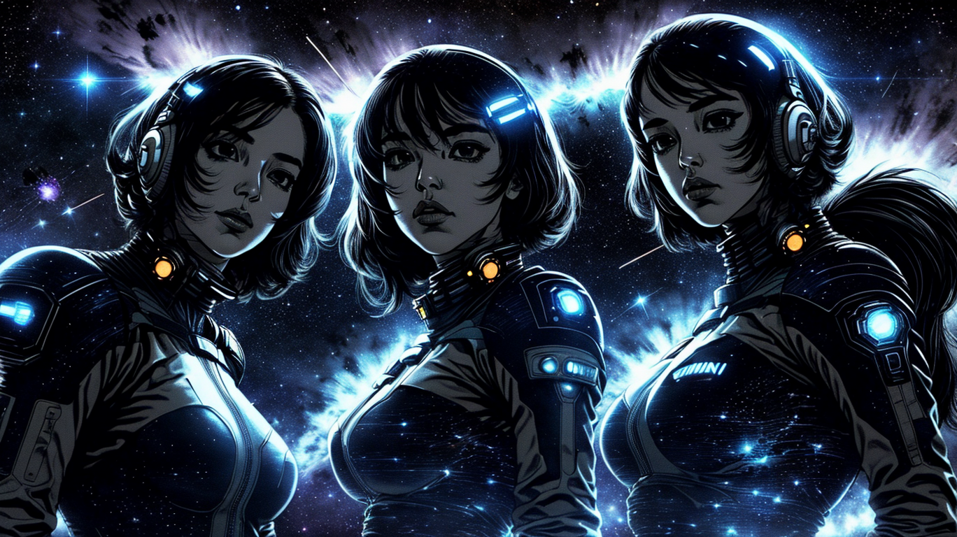 Pen and Ink Illustration of a Futuristic Space Opera, featuring a Fearless Space Captain Commanding a Crew of Diverse Aliens on an Interstellar Mission, set against a Vast Cosmic Background filled with Glowing Stars and Nebulas, using a High-contrast Black and White Palette in the style of Buichi Terasawa's, boichi manga style, greyscale, monochrome, <lora:add_detail:1> <lora:add_saturation:1> <lora:add_sharpness:1> <lora:boichi_manga_style_offset:1>