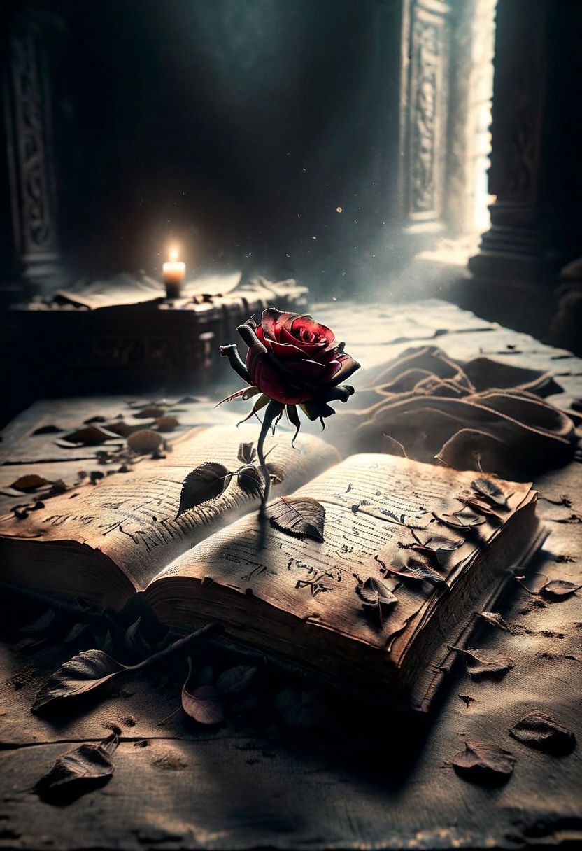 A withered ais-crsd rose lying on an ancient book, its petals blackened and curled, on a table covered in dust. <lora:ais-crsd-sdxl:1>,volumetric lighting), (dynamic lighiting), godrays, Rembrandt lighting, real shadows, intricate detail