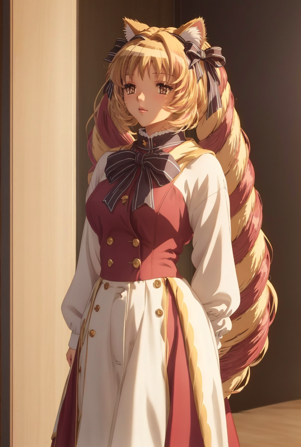 <lora:kanon_2006:1.4>, <lora:My LORA:0.8> Himeko, very long hair, red eyes, hair bow, twin_drills, twintails, long hair,cat ears, yellow cat ears, (((masterpiece))), (((best quality))), (((illustration))), (((finely detail))), ((extremely detailed cg unity 8k wallpaper, highres)), (beautiful detailed face and eyes and hair:1.1), (an extremely delicate and beautiful girl:1.2), ultra-detailed, ultra high res, high quality, 4K, extreamly delicate and beautiful, full_body, standing, in full growth, hourglass waist