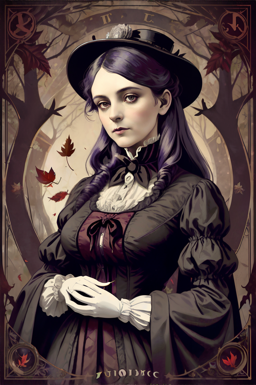 <lora:victorianesoteric:0.4> victorian_esoteric, victorian poster of a woman, rustling of leaves in a foreboding forest, soft serenade of nightingales, (purple, red, white palette), masterpiece, 8k, high resolution, shallow depth of field, sharp focus