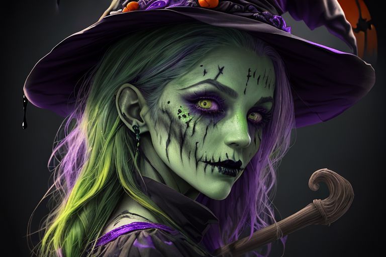Halloween beautiful portrait of a Hallowen witch, green skin, ink stained hair, from behind sitting on a broomstick, ink dripping broomstick, broomstick brush, orange, purple, black gradients<lora:SDXLInkStainsFinal:1> Inkstains, high quality, beautiful, highly detailed, 8k, fantasy