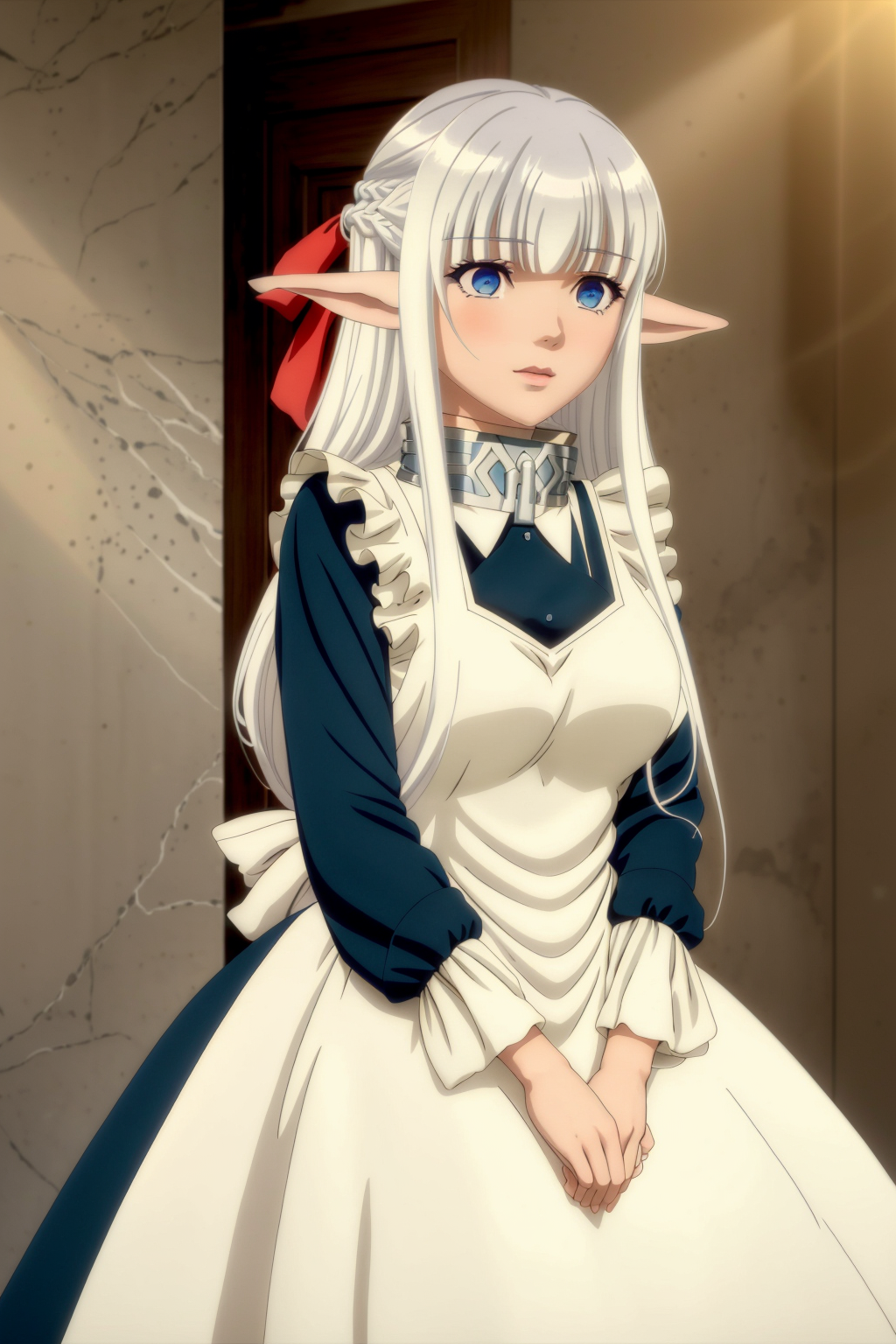 apron, maid, collar,dress, long sleeves, frills <lora:nephilia:1> nephiliawz,pointy ears,blue eyes,very long hair,large breasts,white hair,elf,blunt bangs,braid,hair ribbon <lora:Iselestia_style:0.3>, anime style, anime colors,detailed anime,animeHD, anime eyes, bigger eyes, high quality anime, large anime pupils, 1girl (in full growth), best quality, masterpiece, ultra-detailed, high quality,perfect anatomy, (perfect full body), (detailed full body), good eyes, perfect face, pretty face,(beautiful and aesthetic:1.2),beautiful eyes, anime eyes, detailed eyes,Exquisite visuals, high-definition,