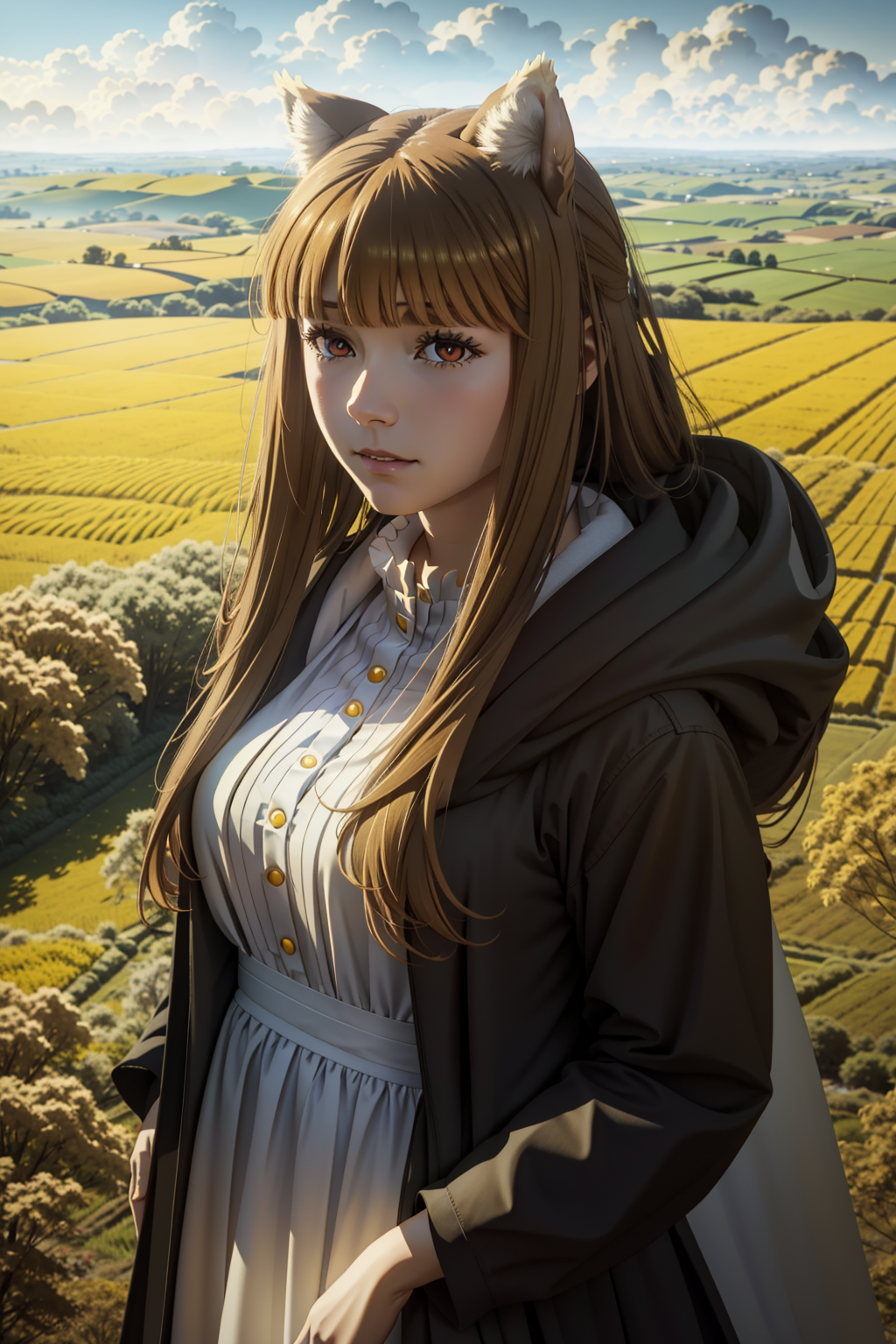 <lora:holo:0.7>holo,red eyes,brown hair, yellow hair,wolf ears, wolf tail, long hair,small breasts,,fields, yellow field, field with yellow flowers, <lora:ФеÑн ÑÑиÑен пÑовожаÑÑÐ°Ñ Ð² пÑоледнйи пÑÑÑ((aafern,long hair,purple hair,blunt bangs,purple eyes,large breasts,long dress,(white dress,black robe,long sleeves(Ñм):1> long dress,white dress,black robe,long sleeves, 1girl in full growth, best quality, masterpiece, ultra-detailed, high quality, perfect nose, highly detailed skin, warm skin tone, defiance512, RAW photo, best quality, high resolution, (masterpiece), dreamlike, dreamy, modelshoot style, analog style, tonemapping, photorealistic, professional photography, sharp focus, HDR, 8K resolution, intricate detail, sophisticated detail, hyper detailed, (depth of field), highlight and shadow, volumetric lighting, cinematic bloom, professional light, looking at viewer, blotchy,