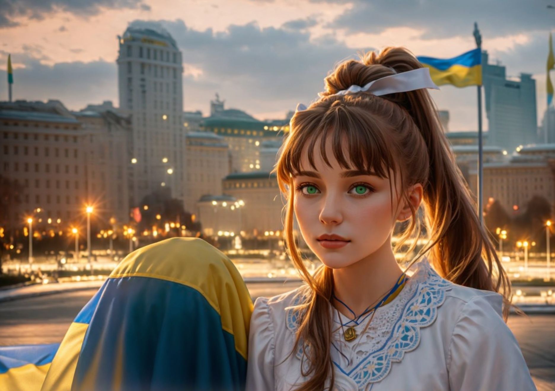 (masterpiece, best quality, 8K, detailed, selfie, close to camera), an extremely delicate and beautiful, (Monika, ponytail, green eyes, gorgeous girl, soft smile, big white ribbon, ((Kyiv, Independence Square in Kyiv, Ukrainian flag at the background))), auburn hair, very long hair, early morning, tilt head, <lora:FilmGirl:0.5>, <lora:DDLC:0.8>, <lora:Ukraine:0.7>