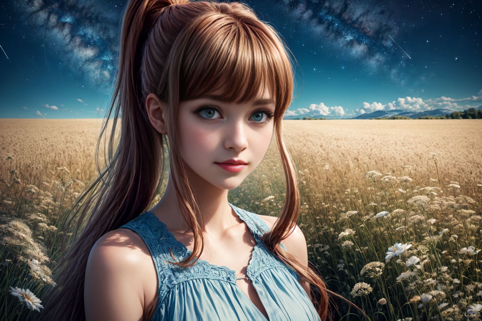 (masterpiece, best quality, 8K, detailed, photo predominance of soft blue colors, close to camera), an extremely dreamlike and beautiful, (Monika, green eyes, very long hair, ponytail, soft smile, ((dream, stars, field))), <lora:DetailEnhancer:0.8>, <lora:DDLC:0.7>